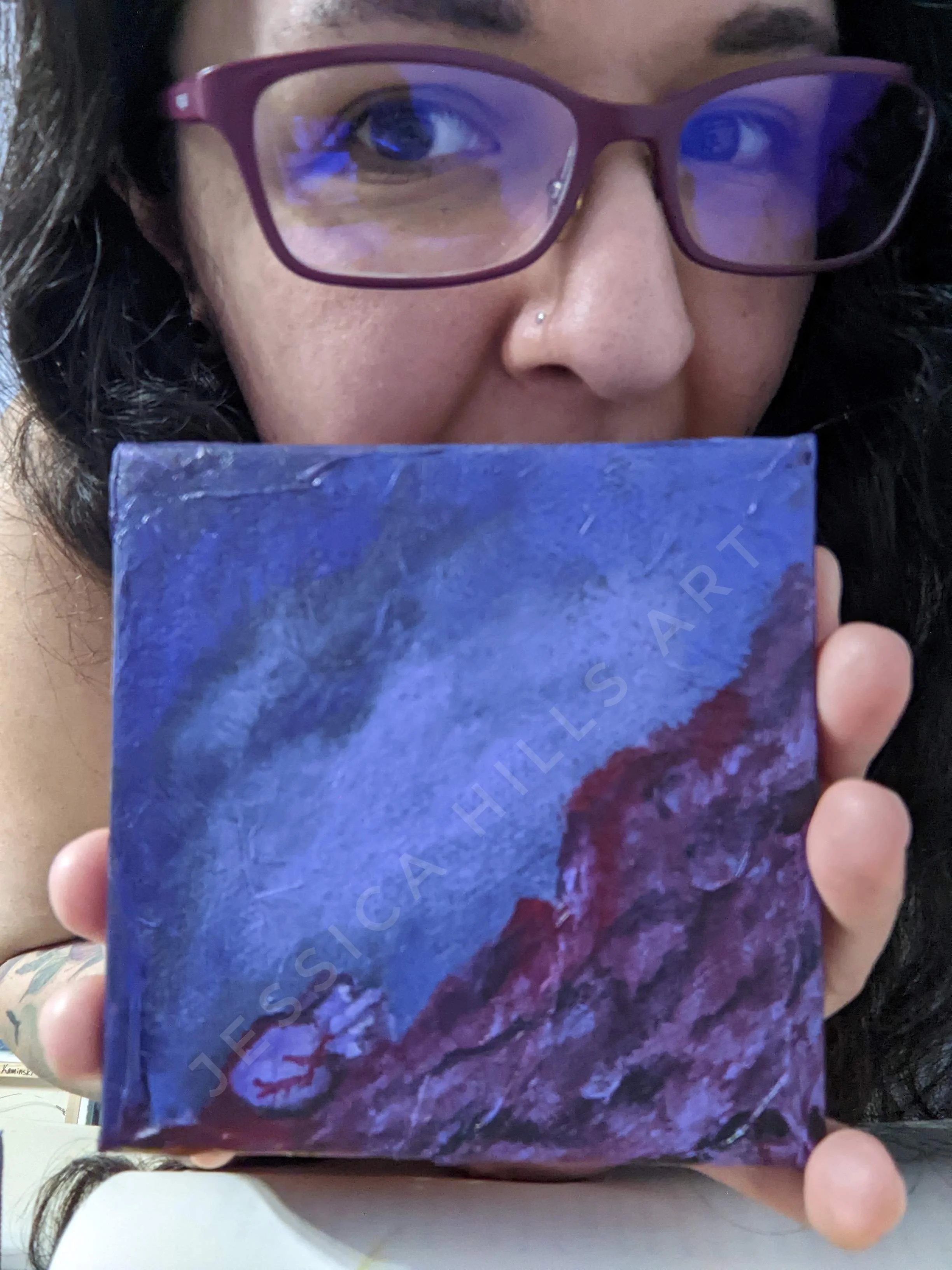 Purples were the main color scheme. One night, I came across this idea of purples, a heart that fell and tumbled down into a cavern, that feeling of solitude and loss. This is also one of the smallest paintings I’ve even done. I quite enjoyed this challenge, especially since it came together like I hoped, if not better. Background started with a layer of paint, then added tissue paper over it. I played more with different brands of paint; used tiny paint brushes. This might be my favorite piece so far.
